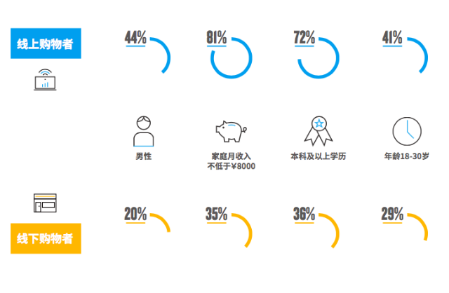 網絡購物者相對而言更富有、年輕、教育水平高。其中,近58%的網絡消費者家庭月收入高於1萬元人民幣,而線下消費者中這一比例為21%。